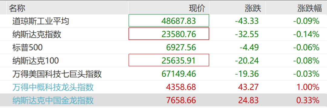 圣诞节后首个交易日,美股三大指数开盘涨跌不一,纳指涨0.14%,标普500指数涨0.08%,道指跌0.03%。截至发稿,美国三大股指悉数跳水,中概科技龙头指数强势飘红,涨幅达1%。