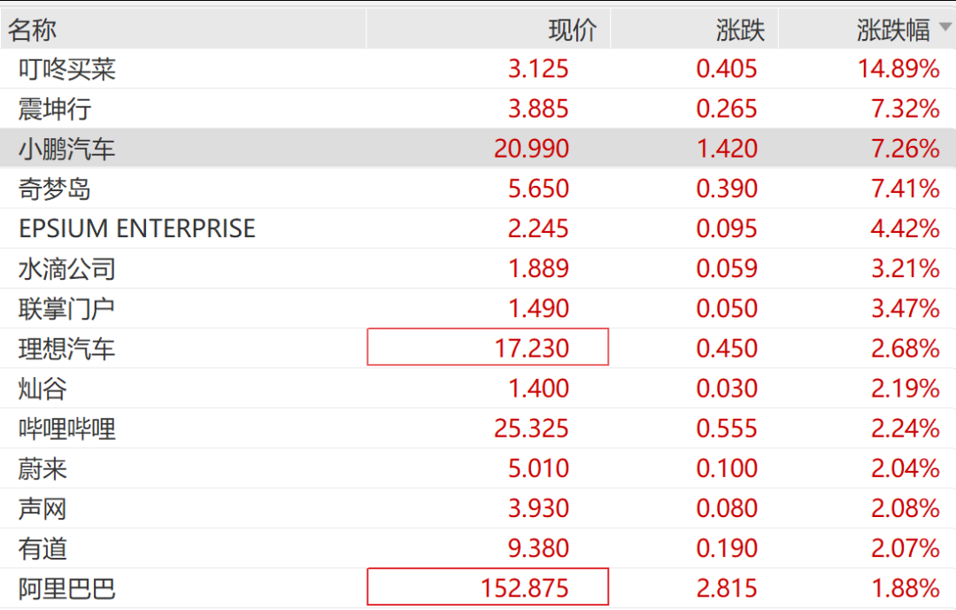 纳斯达克金龙中国指数盘初涨0.44%,截至发稿,中概科技龙头爆发,热门中概股叮咚买菜一度飙涨超20%,小鹏涨超7%,理想涨超2%,蔚来、哔哩哔哩涨超2%,百度、阿里巴巴、贝壳、京东、爱奇艺等全线走高。